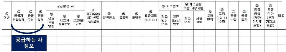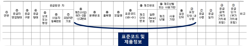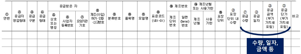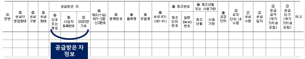 상호 또는 명칭, 사업자등록번호(제조, 수입, 판매, 임대, 의료기관), 요양기관 번호(공급받은 자가 의료기관인 경우)