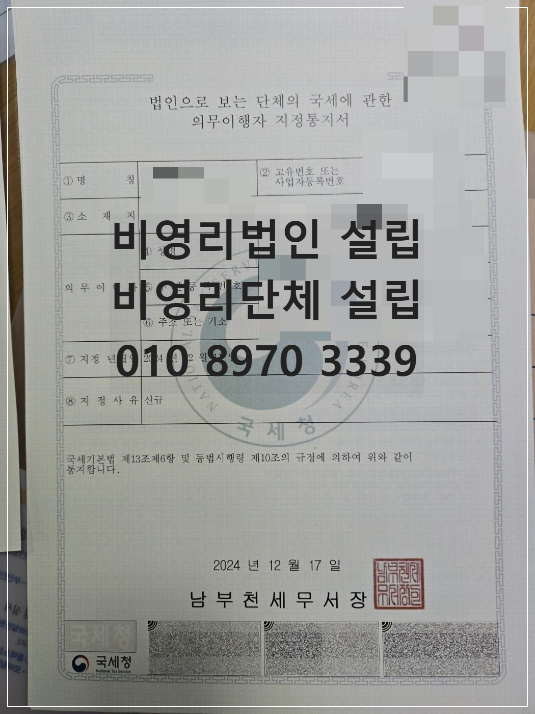 고유번호증 발급 완료 비영리단체 협회 설립 서울시 노원구