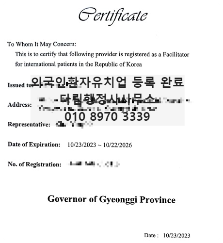 대표님께서 10월 말에 중국으로 출국하여 거래처와 업무 협약을 맺을 예정이셨기에 외국인환자유치업 등록증이 반드시 필요하셨습니다. 출국 전에 외국인환자유치업등록증을 교부받아서 정말 다행이었습니다.